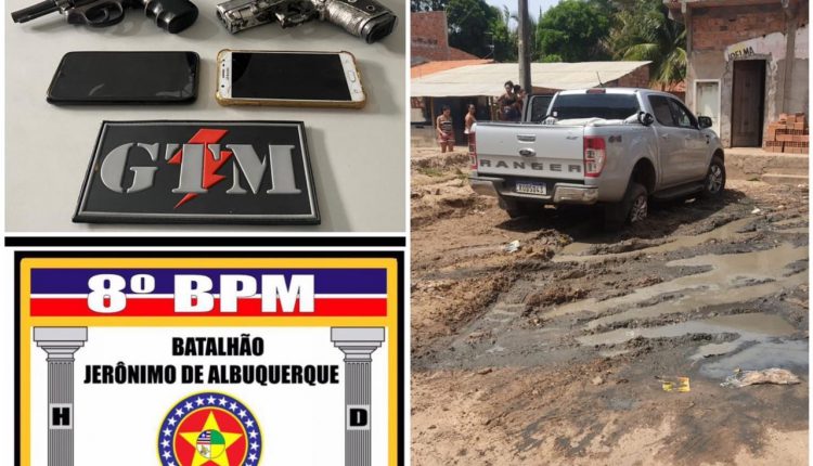 As informações dão conta que nesta quinta-feira, por volta das 13:h00, no bairro da Vila Conceição, a guarnição da Viatura do GTM do 8° BPM, estava efetuando rondas na Avenida Jerônimo de Albuquerque, nas proximidades do Supermercado Atacadão, quando deparou -se com dois elementos num veículo Ranger prata, placa ROD 5D43, quando eles observaram a viatura empreenderam fuga sentido curva do 90.