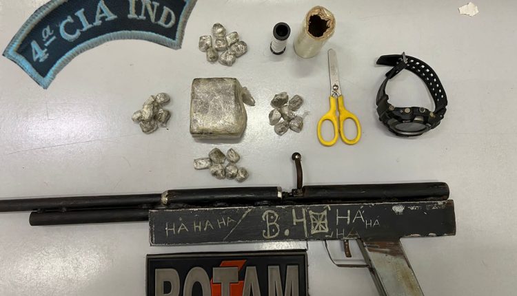A ação da Policia Militar por meio da ROTAM apreendeu a arma de fogo de fabricação caseira. Foram apreendidos ainda: 25 papelotes e mais 250 gramas, aproximadamente de uma substância semelhante à maconha; E aínda um relógio; uma televisão Samsung; linha, tesoura e papel insufilme.