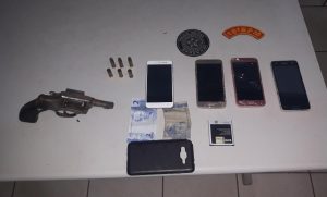 Durante a revista pessoal, os policiais encontraram um revólver calibre .38 com três munições, uma quantia em dinheiro, além dos celulares que foram subtraídos das vítimas.