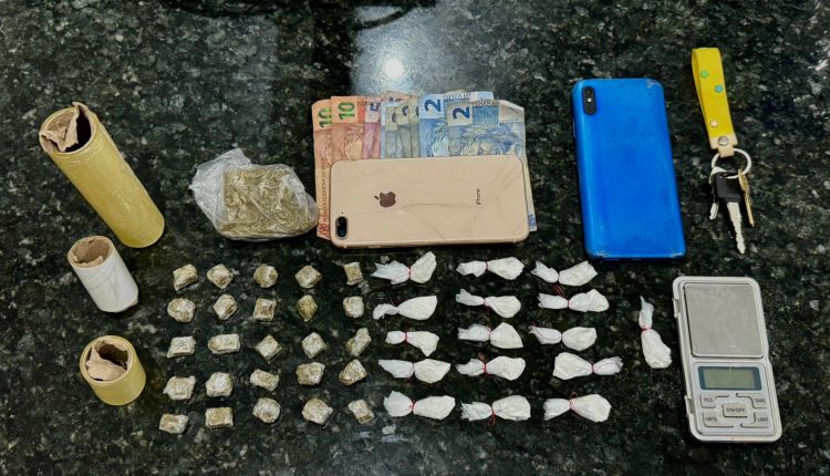 Na residência do suspeito, os policiais encontraram trouxinhas de cocaína e de maconha, prontas para venda, balança de precisão e rolos de papel filme, celulares, uma motocicleta e uma pequena quantia em dinheiro.