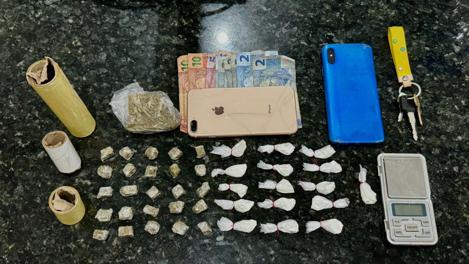 Na residência do suspeito, os policiais encontraram trouxinhas de cocaína e de maconha, prontas para venda, balança de precisão e rolos de papel filme, celulares, uma motocicleta e uma pequena quantia em dinheiro.
