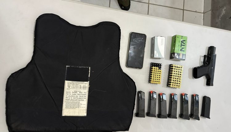 Com o suspeito, foram apreendidos uma pistola Glock calibre 9 mm, grande quantidade de munições, carregadores de uso restrito e uma placa de colete balístico.