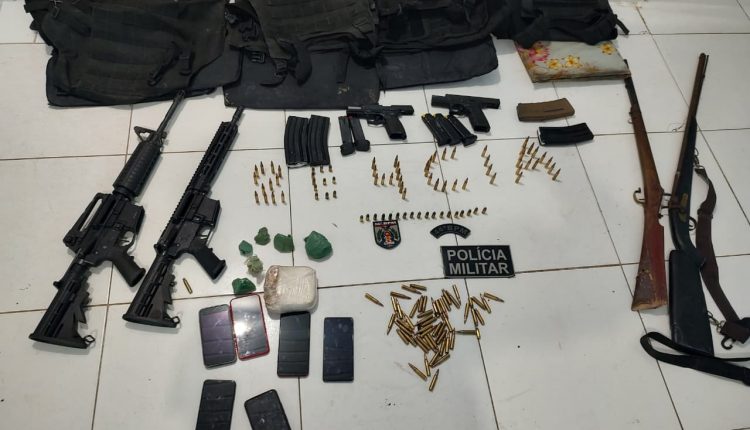 Entre os materiais apreendidos estão dois fuzis semiautomáticos calibre 5.56, sendo um deles sem numeração; duas pistolas (uma G3 e uma TS9) e duas armas de fabricação caseira, tipo “bate-bucha”.