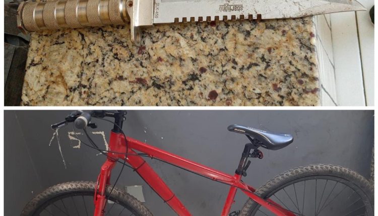 Os policiais procederam a abordagem e revista pessoal e apreenderam uma faca e uma bicicleta que estava em posse do indivíduo.
