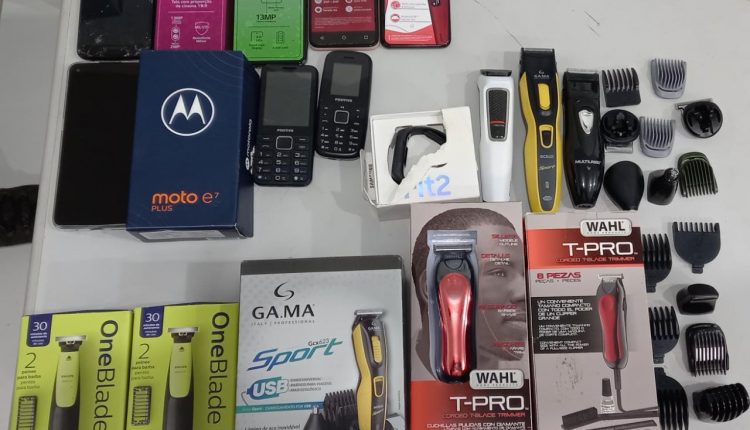 02 revólveres CAL. 38 com 12 munições intactas; 01 espingarda tipo bate buchas; 02 motos; 02 carros; 02 capacetes; 03 relógios dourados; 01 óculos de sol; 01 carteira porta células; 02 porções pequenas de substância semelhante a cocaína; R$ 524,00 em espécie; 2 CNH e 2 RG; 01 caixa de som portátil; 1 molho de chaves; 11 celulares; 07 maquinas de cortar cabelo; 01 Smartwatch; 10 Tablets; 04 notebooks; 02 pares de tênis; 01 balança de precisão; 01 pulseira dourada.