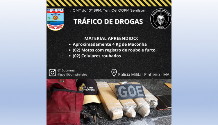 O Grupo de Operações Especiais (GOE), do 10º Batalhão de Polícia Militar, prendeu, na manhã desta quarta-feira (16), em Pinheiro, três indivíduos que estavam em posse de aproximadamente 4kg de substância análoga à maconha, além de duas motocicletas com registro de roubo e dois celulares roubados.