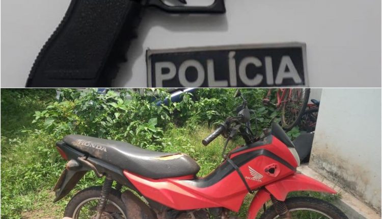 Ao ser realizada a busca pessoal no indivíduo, foi encontrado um simulacro de arma de fogo (pistola), que segundo a vítima foi utilizado para coagi-lá no momento em que o autor roubou sua motocicleta.