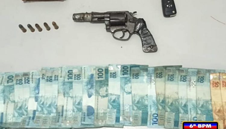 Ao chegarem ao local, os policiais encontram o veículo com o casal a bordo que desembarcaram após solicitação e, durante busca pessoal, foi encontrado, na cintura do homem, um revólver cal. 38 e, no interior do veículo, 05 munições e uma quantia em dinheiro no valor de R$ 3.300,00.