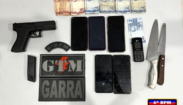 Os elementos foram abordados e foi constatado que o objeto era UM SIMULACRO DE ARMA DE FOGO e com o outro foi encontrado duas facas; foram encontrados ainda 06 aparelhos celulares e uma quantia de R$ 84,00.