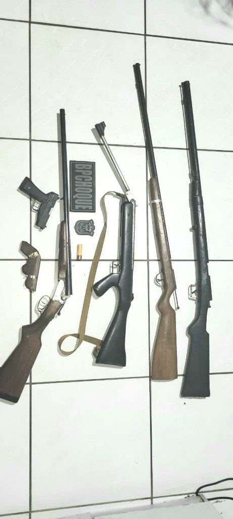 Ao entrarem na residência, os policiais encontraram um homem e com ele, uma espingarda cal.20, uma espingarda de fabricação caseira tipo bate bucha, uma espingarda de fabricação caseira tipo bate bucha de cor preta, um revólver de fabricação caseira tipo garruncha, além de duas motocicletas e uma bicicleta.