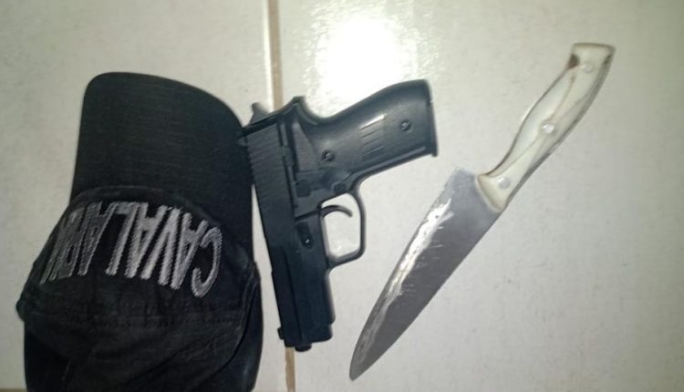 Os policiais iniciaram o acompanhamento tático, conseguindo interceptar o veículo. Dentro dele, foram presos dois homens, além dos policiais apreenderem um simulacro de arma de fogo e uma fica do tipo peixeira.