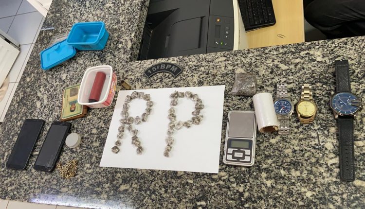 Com a permissão do proprietário e após uma busca na residência, foi encontrado: 02 (dois) celulares; 41 (quarenta e um papelotes de uma substância que aparenta ser “tof”; 01 (uma) uma balança de precisão; 01 (um) cartucho com pólvora; 01 (uma) cápsula deflagrada de cartucho 44; 03 (três) relógios; documentos; 01 (um) cordão dourado; 01 (um) cordão prateado; 24 (vinte e quatro) caroços de chumbo; 01 (um) plástico usado para embalar “tof”; 01 (um) relógio preto; 01 (um) recipiente com pólvora e 01 (uma) porta cédula com um cartão.