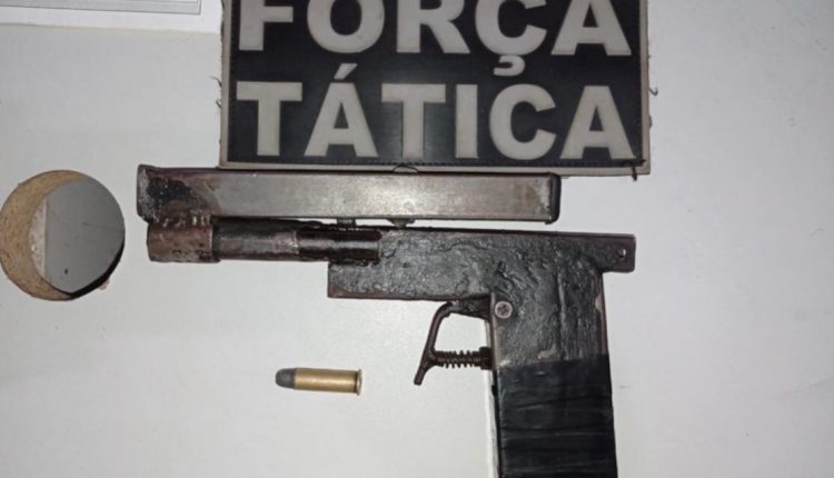 Houve um acompanhamento tático e os indivíduos acabaram sendo interceptados pela guarnição, que ao realizar uma busca pessoal, encontrou em poder dos elementos uma arma de fogo de fabricação caseira, que calça munição calibre 38.