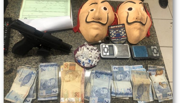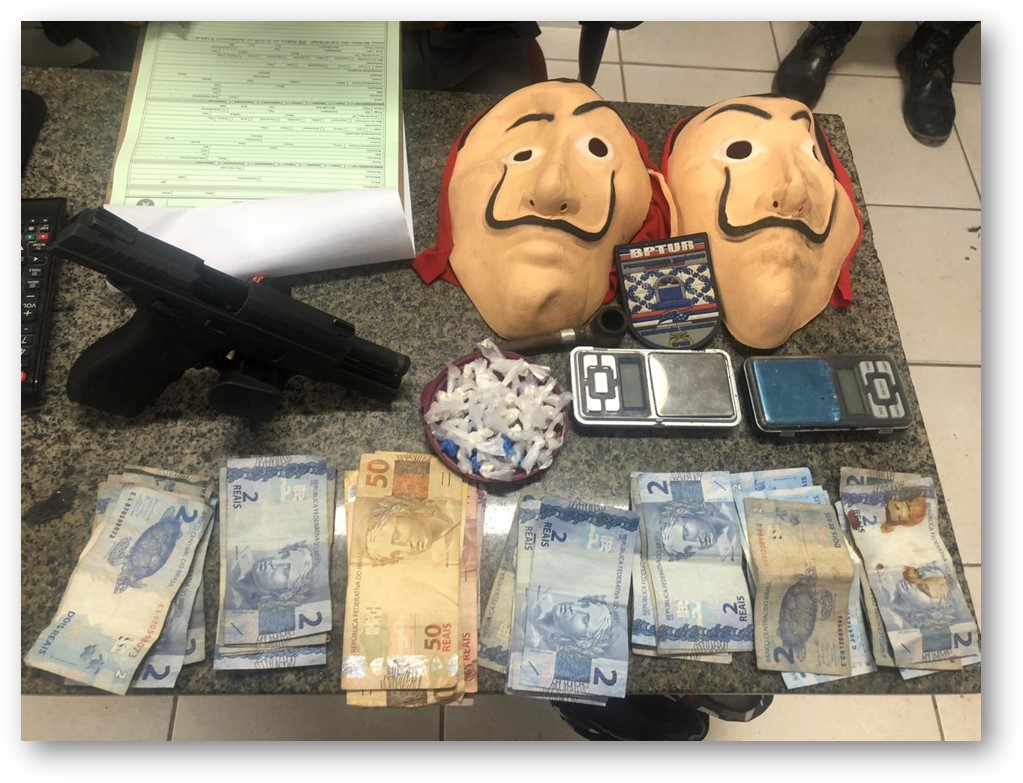 Polícias Militar e Civil de Barreirinhas prendem 03 acusados. Eles estavam com uma pistola, munições, entorpecentes, dinheiro e 02 máscaras Salvador Dalí