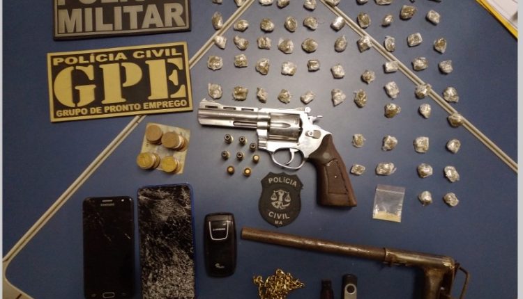 Os investigadores cumpriam mandados de busca e apreensão em endereços de pessoas investigadas pelo crime de tráfico de drogas no município de Estreito. Em uma das residências alvo da operação, os policiais apreenderam duas armas de fogo e uma quantidade expressiva de drogas, além de celulares e joias, ocasionando numa prisão em flagrante.