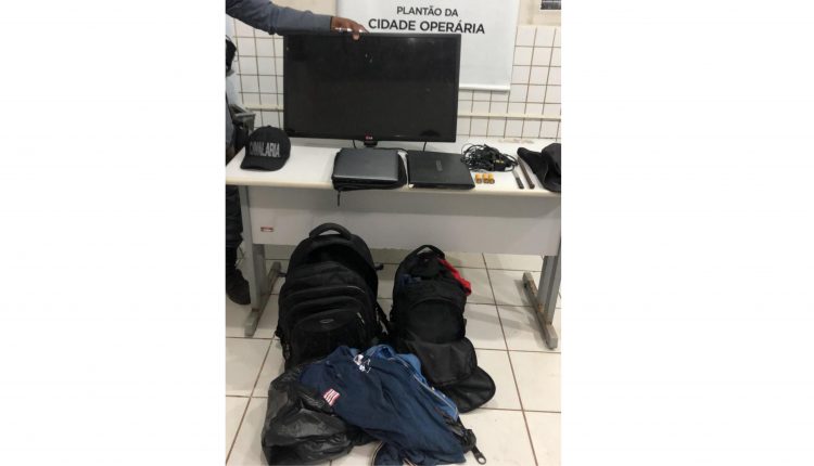 Ao adentrar o imóvel abandonado, os policiais encontraram 2 Notebooks, uma TV de 32″, 14 peças de roupas, 3 pares de tênis, 3 mochilas, provavelmente produtos de crimes, além de 3 munições de espingarda Calibre 20, intactos.