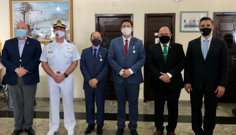 Acompanhando do Comandante da Polícia Militar, Coronel Pedro Ribeiro, o Secretário recebeu a comenda das mãos do Capitão dos Portos do Maranhão, Capitão de Mar e Guerra, Alekson Barbosa, e do Presidente do Tribunal Marítimo, Vice-Almirante Wilson Pereira de Lima Filho.