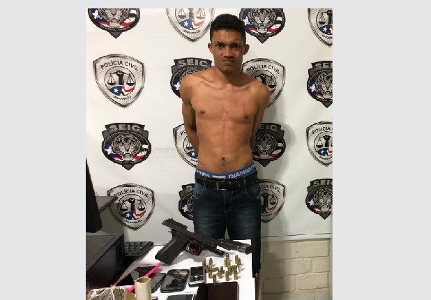 JP foi preso no bairro da Ilhinha na posse de uma pistola .40 de uso exclusivo das forças de segurança acompanhada de dois carregadores e 24 munições de mesmo calibre, além de cerca de 300g de maconha prensada, papel filme e balança de precisão.