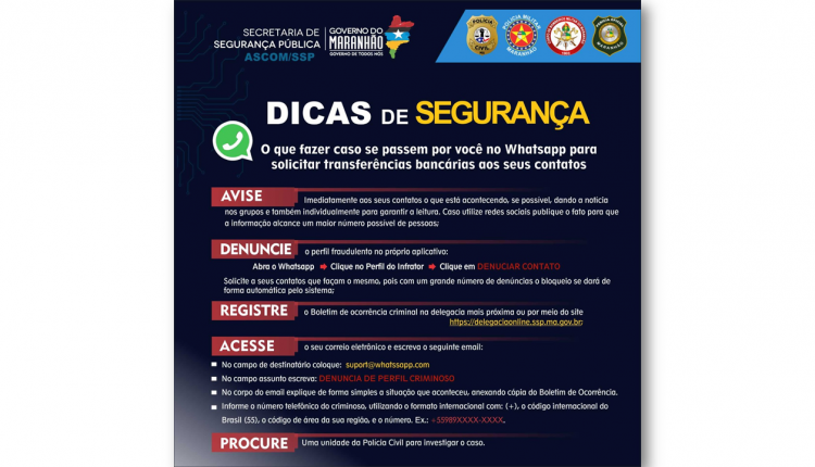 SSP-MA INFORMA O QUE FAZER CASO SE PASSEM POR VOCÊ NO WHATSAPP PARA SOLICITAR TRANSFERÊNCIA BANCÁRIAS AOS SEUS CONTATOS