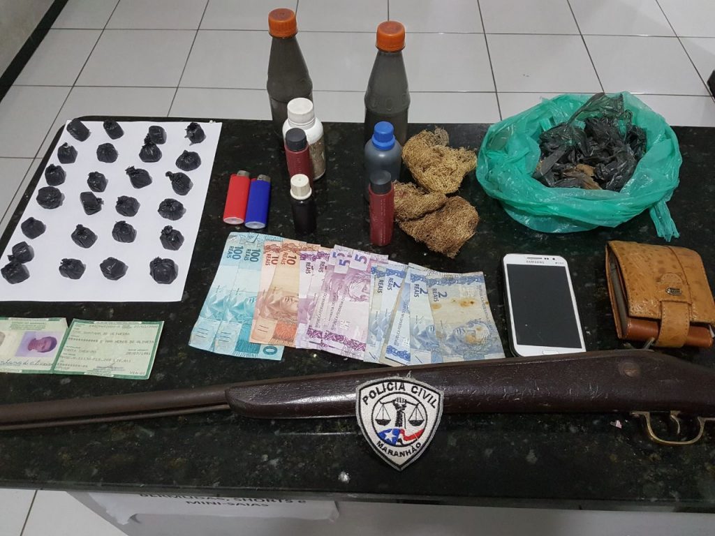 No interior da residência, a polícia conseguiu localizar após revistas, uma espingarda e insumos para fabricação de munição. Além disso, foram encontradas no quintal da residência 25 porções de uma substância similar a maconha que estavam prontas para ser comercializadas. De imediato foi dada a voz de prisão a “Caçula”, que posteriormente foi encaminhado a delegacia onde foi autuado pelos crimes de tráfico de drogas e posse ilegal de arma de fogo.