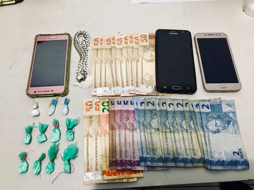 Em meio a um patrulhamento na Rua Riacho Doce, a PM avistou o trio em atitude suspeita, sendo necessário a realização de uma revista pessoal, localizando 11 (onze) trouxas de uma substância semelhante a cocaína, 3(três) aparelhos de celulares, joias e cerca de 746 reais em espécie.